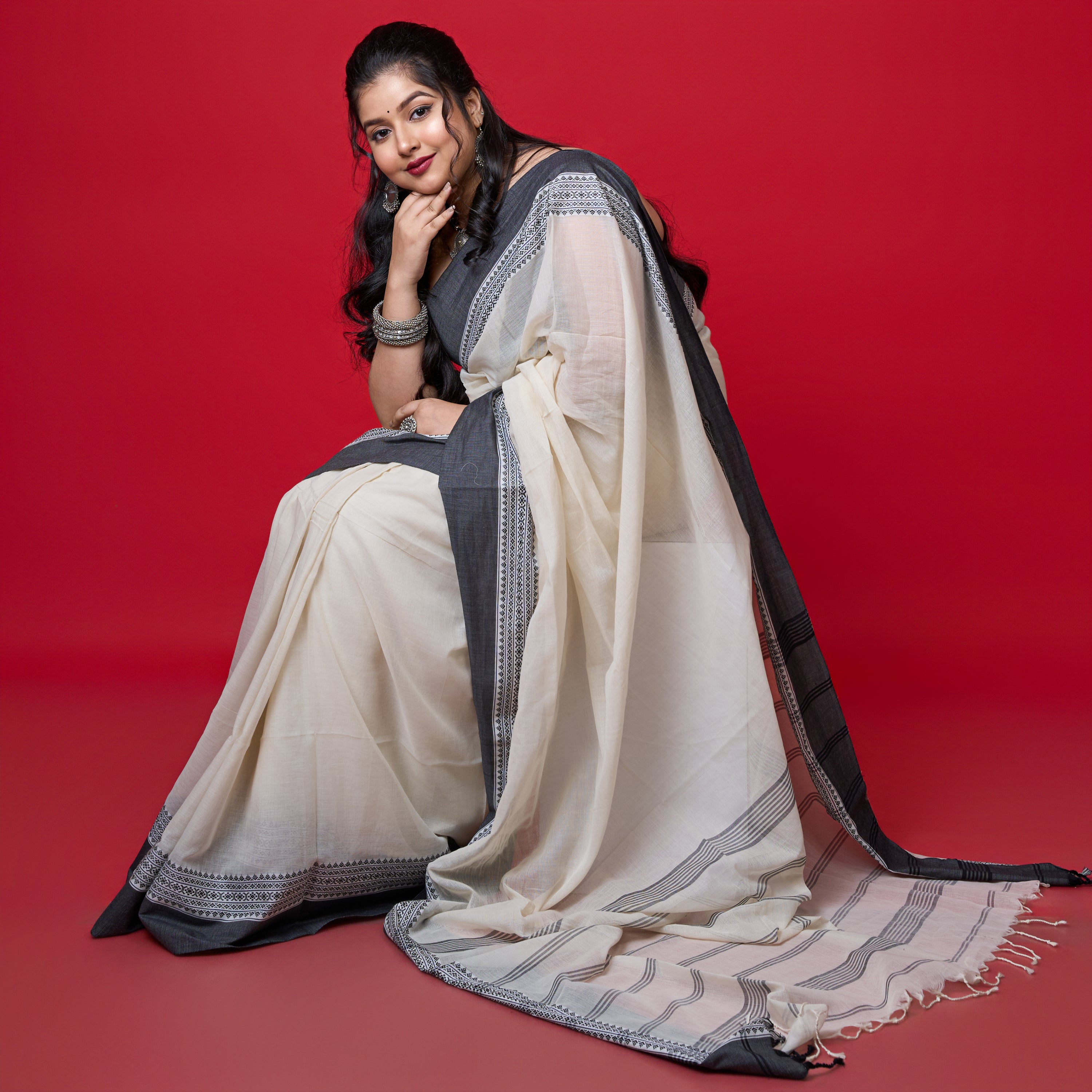 A cotton baluchari saree in bright yellow colour. The border, butis and pallu are woven in red and white colour